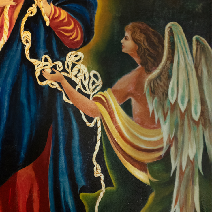 Vertical Oil Painting 96 x 48 inch, Where the Virgin Mary, bathed in heavenly light, gently unties the knots of human suffering and sorrow. Surrounded by angels and illuminated by the Holy Spirit descending as a dove, she radiates serenity, love, and divine mercy. The scene glows with warmth and peace, symbolizing hope, healing, and the tender power of faith to bring light where life feels tangled.