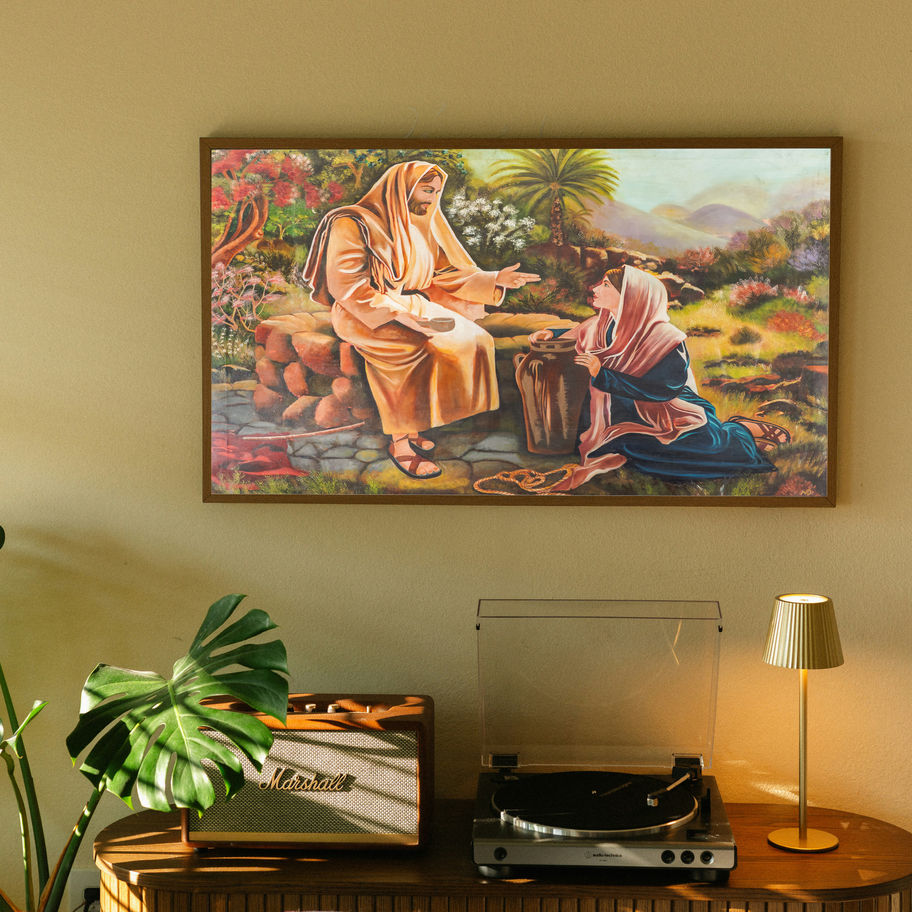 Horizontal Oil Painting 22 X 45inch, This title beautifully reflects the divine encounter between Jesus and the Samaritan woman at the well — a moment filled with grace, compassion, and spiritual awakening. The scene captures the warmth of His presence and the woman’s awe as she receives the promise of “living water,” symbolizing eternal life. Set against a backdrop of lush nature and golden light, the painting radiates peace, renewal, and the transformative power of divine love.