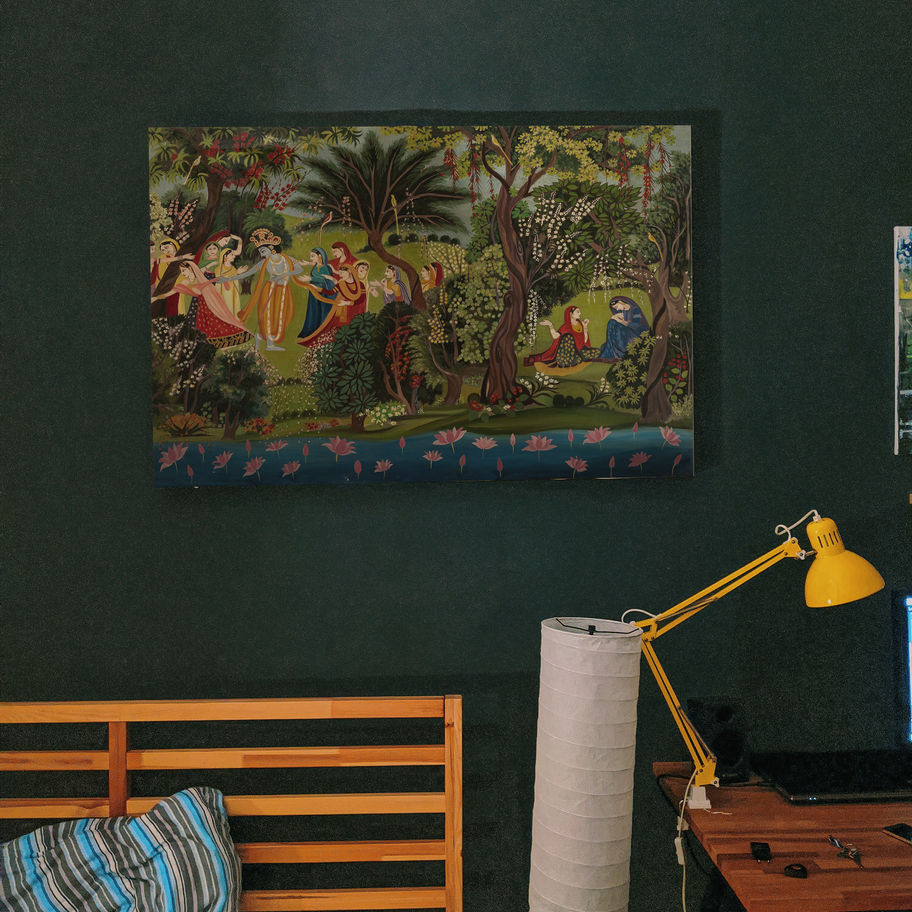 Vertical Oil Painting 35 x 23 inch, The artwork hanging on the wall is a vibrant tapestry of color and serenity. Set in an enchanted forest, the scene unfolds like a whispered tale from ancient lore. A group of graceful figures, dressed in flowing traditional garments, gather beneath towering trees and blossoming foliage. Their postures feel lively yet peaceful — as if caught mid-conversation or mid-song, sharing a quiet moment of joy.